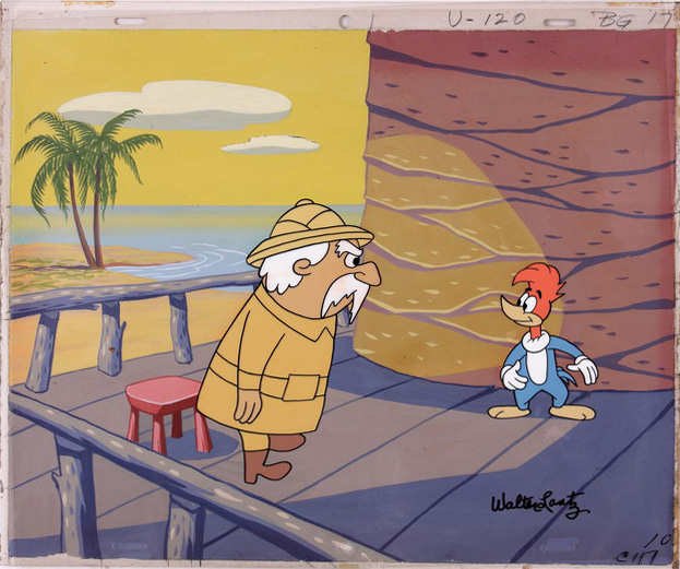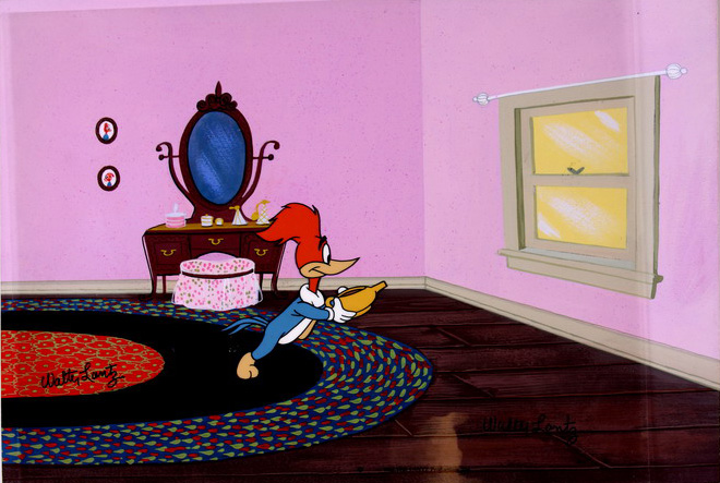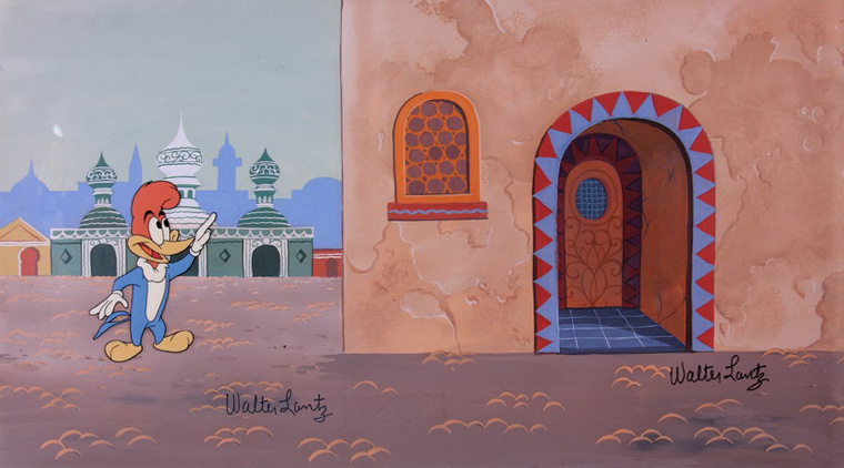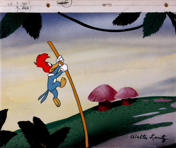 An original hand painted animation cel, mounted above a hand painted background. Hand signed by Walter Lantz.