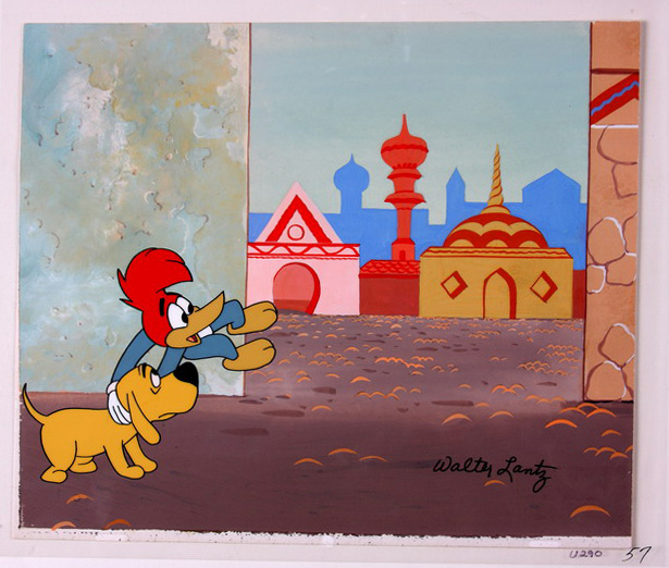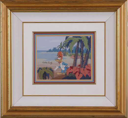 A very rare 1940's hand painted animation cel, mounted above a hand painted background. hand signed by Walter Lantz.